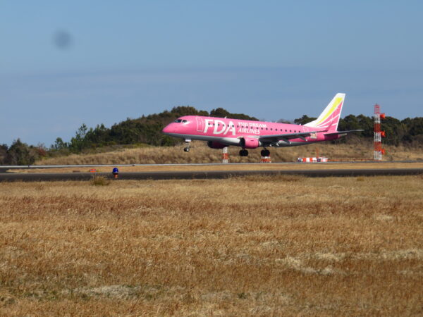 飛行機が目の前で着陸 まだ機体が浮いてます