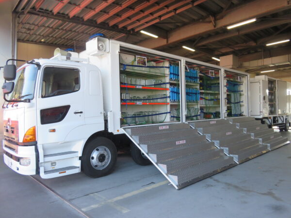 消防車両の前で